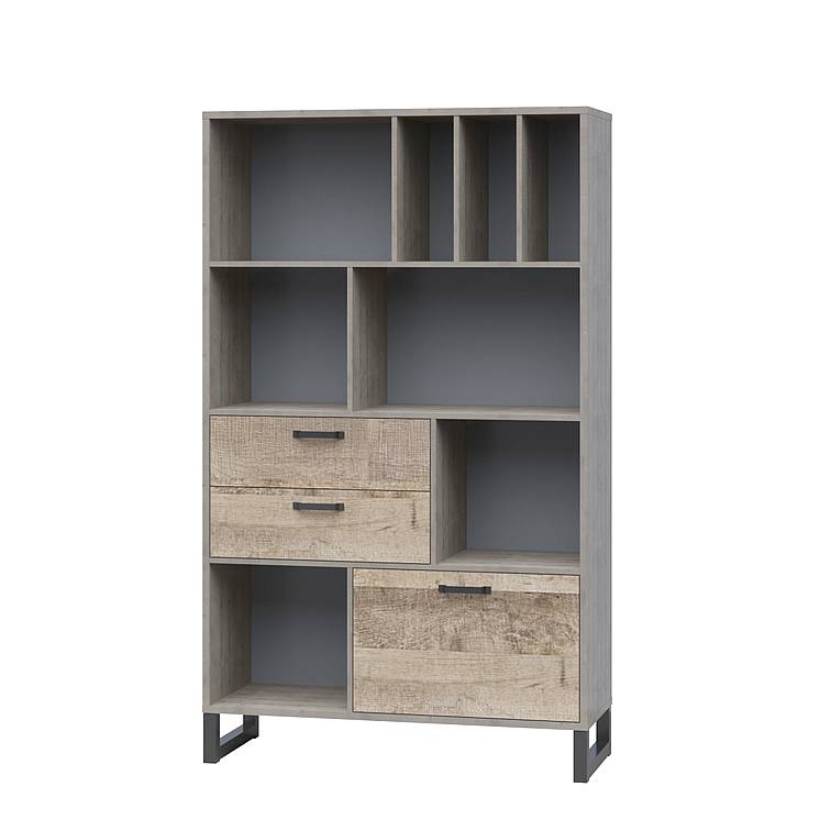 BARI regál 1d2s - nachází v horní částí otevřený prostor pro knihy a jiné upominkové předměty či fotografie, uprostřed se nachází  dva šuplíky a v dolní části po pravé straně malá skříňka.   MEBEL BOS je kolekce nábytku, který ladí klasickými interiéry. Tvary kolekcí vypadají skvěle v takových místnostech, jako jsou: obývací pokoj, ložnice, pokoj pro mládež nebo jídelna. Nábytek je zaměřený na nadčasovost a funkčnost.   Kolekce BARI je vyrobena z lamina. Čela a dvířka jsou z LDTD o síle 22 mm, PCV hrany. Nábytek je opatřen černými kovovými úchyty a černýma kovovýma nožkama. Kolekce BARI má originální ultramoderní design, netradiční uspořádání polic, zásuvek a taky tvrzené sklo u dveří vitríny.   Nábytek v kolekci BARI dodáváme v barevném deseně: šedá / dub pískový.   Nábytek je určen pro samostatnou montáž, dodáván v balících.