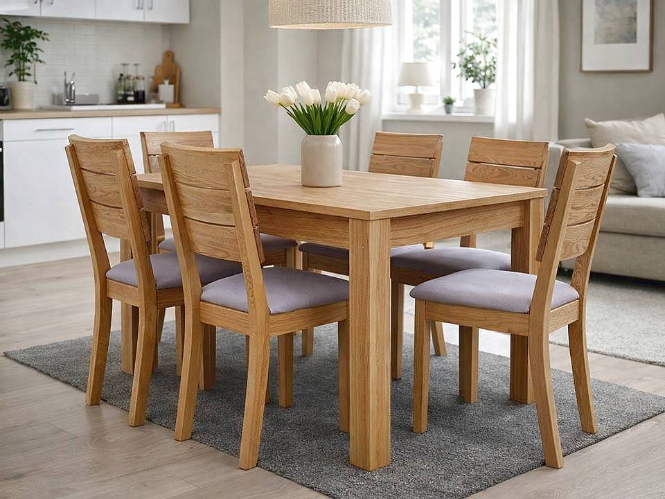 Elegantní dubová jídelní sestava INSYGNATA zahrnuje rozkládací stůl a 4 čalouněné židle z masivu s olejovaným povrchem. Díky praktickému rozkládacímu mechanismu stolu nabízí dostatek místa pro každodenní stolování i větší rodinné oslavy. Nadčasový design a kvalitní zpracování zaručují, že sestava bude stylovým a spolehlivým prvkem vaší jídelny po mnoho let.