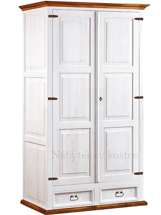 Rustikální dvoudvéřová šatní skříň SWEET HOME SAV22B z borovicového masivu s bílým korpusem a hnědými voskovanými detaily. Uvnitř naleznete police pro přehledné uložení oblečení. Vytvoří voňavou atmosféru francouzského venkova Provence.