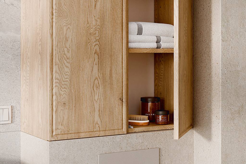 Horní skříňka z kolekce Terra Cremona vyniká čely s jemně frézovaným rámem a dekorem dub Cremona, který podtrhuje přirozenou kresbu dřeva a dodává nábytku teplý a elegantní vzhled. Uvnitř nabízí praktický úložný prostor s policemi, zatímco stříbrné kovové úchytky doplňují design o moderní a stylový prvek.