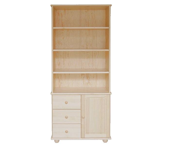 Knihovna je vyrobena z borovicového masivu. Tato knihovna nabízí dostatek úložného prostoru. Knihovna nabízí 3 police, 3 šuplíky a skříňku s dvířky s jednou policí uvnitř. Záda knihovny jsou z překližky, šuplíky mají kovové pojezdy. Knihovna stojí na kulatých dřevěných nožkách.Nábytek je mořený a poté lakovaný polomatným lakem. Foto je ilustrační. Barevné provedení viz. doplňující obrázek. Vemte prosím na vědomí, že odstín barvy na vzorníku se může mírně lišit od skutečného odstínu na nábytku.