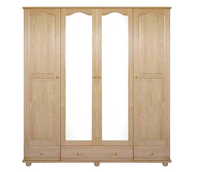 Kombinovaná skříň se zrcadlem je vyrobena z borovicového masivu. Uvnitř skříně se po stranách nachází 3 police, v prostřední části je šatní tyč. Ve spodní části skříně jsou 3 šuplíky na kovových pojezdech. Záda skříně a dna šuplíků jsou ze sololitu. Skříň stojí na kulatých dřevěných nožkách, úchytky jsou dřevěné. Na prostředních dvířkách jsou zrcadla.Nábytek je mořený a poté lakovaný polomatným lakem. Foto je ilustrační. Barevné provedení viz. doplňující obrázek. Vemte prosím na vědomí, že odstín barvy na vzorníku se může mírně lišit od skutečného odstínu na nábytku.