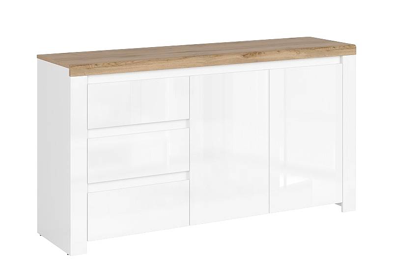 Komoda VIGO 2d3s osloví zákazníky, kteří mají rádi  eleganci. Originální, bílé a bezúchytové přední strany v lesku přínašejí harmonii interiéru. Díky široké a přirozené nábytkové desce vypadá místnost jako z časopisu.   Komoda je krásným doplňkem vašeho obývacího pokoje nebo jídelny.  Je vyrobena z lamina. Na hrany je použita ABS hrana, což zajišťuje odolnost a delší životnost nábytku.   Komoda má 3 šuplíky a 2 dvířek.Zásuvky mají plnovysuvné kovové pojezdy.   Komoda je v odstínu bílý lesk. Odstín se může se skutečností lehce lišit, v souvislosti s nastavením monitoru, světlem apod.   Komoda VIGO lze kombinovat z dalším nábytkem z kolekce VIGO a vytvořit si tak o bývací pokoj či jídelnu  ve stejném designu.
