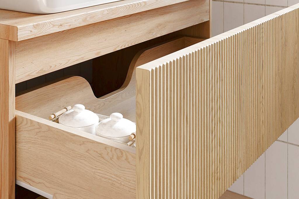 Koupelnová skříňka pod umyvadlo Nordic Cremona 80 cm se dvěma zásuvkami a horní deskou kombinuje moderní styl s přirozenou elegancí dřeva. Dekor Dub Cremona spolu s jemným vertikálním drážkováním na čelech vytváří stylový a nadčasový vzhled, zatímco zásuvky s tichým dovíráním nabízejí praktický úložný prostor pro každodenní potřeby. Koupelnová deska Nature Cremona 80 cm je inspirována vzhledem přírodního dřeva. Její nepravidelně tvarovaná, jemně zvlněná hrana připomíná strukturu masivu a dodává koupelně útulný a autentický charakter.