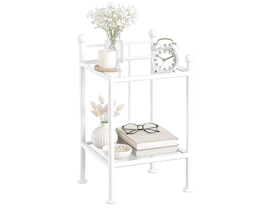 Kovový noční stolek Kajtek - barva bílá je ruční mistrovská práce. Je vyrobený z kvalitní oceli o průměru 22 mm a ručně kovaných prutů o průměru 10 mm. Noční stolek má dvě skleněné poličky o rozměru 34,5 x 34,5 cm a tloušťce skla 4 mm. Kovový noční stolek je pokrytý bílou strukturální barvou, která je nanášená při vysoké teplotě ve stříkací kabině. Jedná se o moderní práškové nanášení barvy. Barva je odolná proti oděru a poškrábání. Barva má charakteristickou strukturu připomínající slupku pomeranče. Celková výška stolku je 62 cm, šířka a hloubka je 40 cm. Horní polička je ve výšce 51 cm, dolní polička je ve výšce 17 cm.Foto je ilustrační.