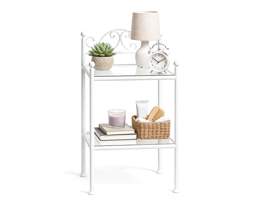 Kovový noční stolek univerzální - barva bílá (viz. doplňující obrázek) je ruční mistrovská práce. Lze ho kombinovat s mnoha kovovými postelemi, které máme v naší nabídce. Je vyrobený z kvalitní oceli o průměru 22 mm a ručně kovaných prutů o průměru 10 mm. Noční stolek má dvě skleněné poličky o rozměru 34,5 x 34,5 cm a tloušťce skla 4 mm. Kovový noční stolek je pokrytý bílou strukturální barvou, která je nanášená při vysoké teplotě ve stříkací kabině. Jedná se o moderní práškové nanášení barvy. Barva je odolná proti oděru a poškrábání. Barva má charakteristickou strukturu připomínající slupku pomeranče. Celková výška stolku je 62 cm, šířka a hloubka je 40 cm. Horní polička je ve výšce 51 cm, dolní polička je ve výšce 17 cm.Foto je ilustrační.