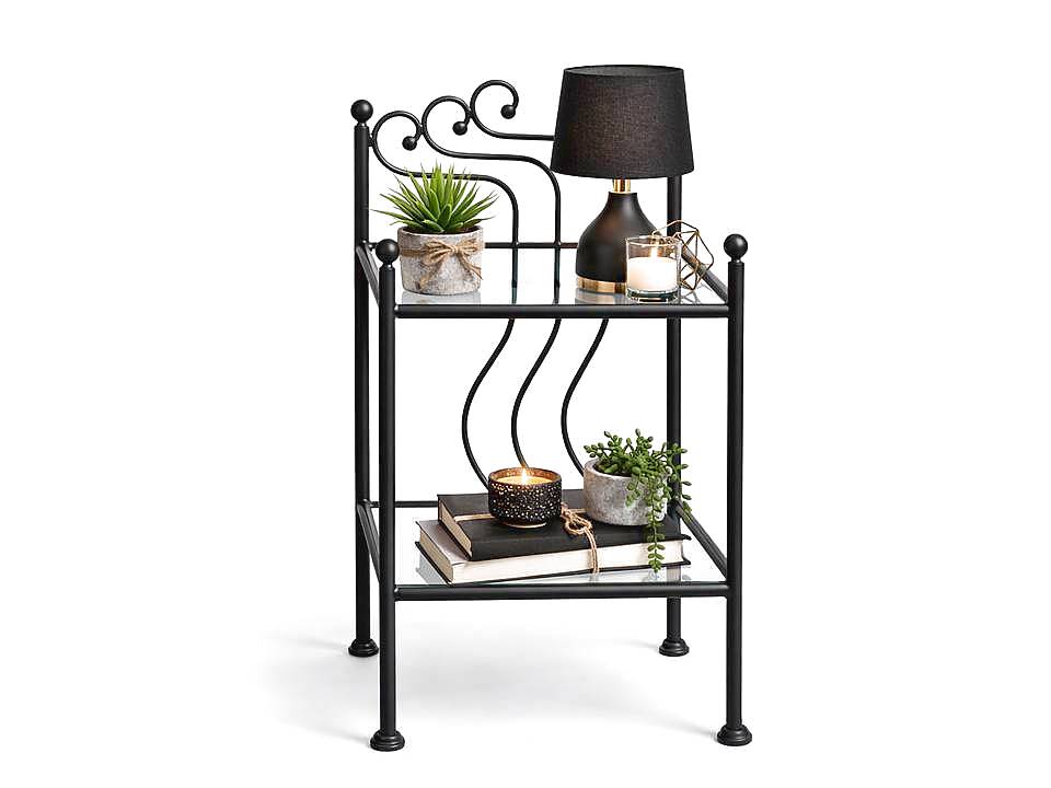 Kovový noční stolek Oáza - Roxana - patina zlatá (viz. doplňující obrázek) je ruční mistrovská práce. Doporučujeme ho kombinovat s kovovými postelemi Oáza a Roxana, které máme v naší nabídce. Je vyrobený z kvalitní oceli o průměru 22 mm a ručně kovaných prutů o průměru 10 mm. Noční stolek má dvě skleněné poličky o rozměru 34,5 x 34,5 cm a tloušťce skla 4 mm. Kovový noční stolek je ve finální fázi natřen základní černou strukturální barvou a je ručně přidáváná zlatá patina.Celková výška stolku je 67 cm, šířka a hloubka je 40 cm. Horní polička je ve výšce 51 cm, dolní polička je ve výšce 17 cm.Foto je ilustrační.
