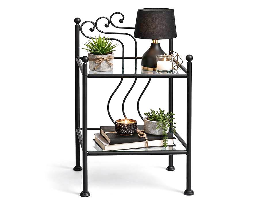 Kovový noční stolek Oáza - Roxana - barva černá (viz. doplňující obrázek) je ruční mistrovská práce. Doporučujeme ho kombinovat s kovovými postelemi Oáza a Roxana, které máme v naší nabídce. Je vyrobený z kvalitní oceli o průměru 22 mm a ručně kovaných prutů o průměru 10 mm. Noční stolek má dvě skleněné poličky o rozměru 44,5 x 44,5 cm a tloušťce skla 4 mm. Kovový noční stolek je ve finální fázi natřen černou strukturální barvou.Celková výška stolku je 77 cm, šířka a hloubka je 49,5 cm. Horní polička je ve výšce 61 cm, dolní polička je ve výšce 19 cm.Foto je ilustrační.
