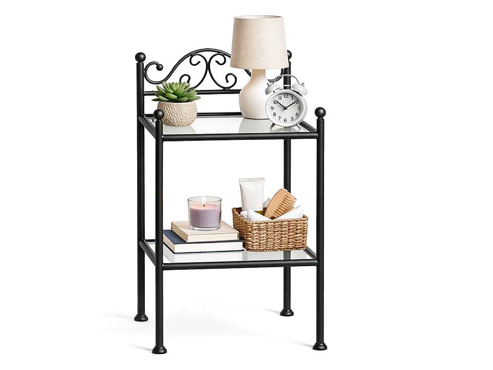Kovový noční stolek univerzální - barva černá (viz. doplňující obrázek) je ruční mistrovská práce. Lze ho kombinovat s mnoha kovovými postelemi, které máme v naší nabídce. Je vyrobený z kvalitní oceli o průměru 22 mm a ručně kovaných prutů o průměru 10 mm. Noční stolek má dvě skleněné poličky o rozměru 44,5 x 44,5 cm a tloušťce skla 4 mm. Kovový noční stolek je ve finální fázi natřen černou strukturální barvou.Celková výška stolku je 77 cm, šířka a hloubka je 49,5 cm. Horní polička je ve výšce 61 cm, dolní polička je ve výšce 19 cm.Foto je ilustrační.