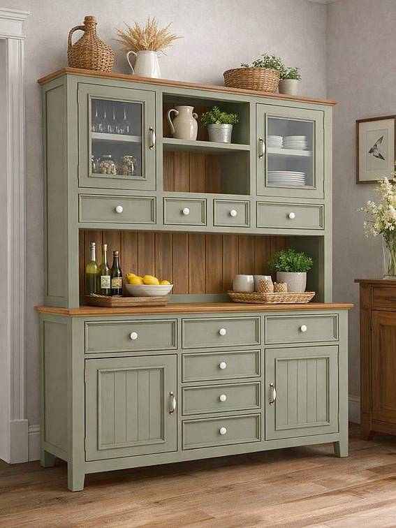 Elegantní kredenc LEVANDE v olivovém odstínu je vyrobena z kvalitního bukového a dubového masivu. Nabízí praktické police, zásuvky a uzavíratelný úložný prostor, který spojuje funkčnost s půvabem venkovského stylu. Svým jedinečným barevným provedením v olivové barvě vnese do jídelny či obývacího pokoje teplo, klid a nádech francouzské Provence.