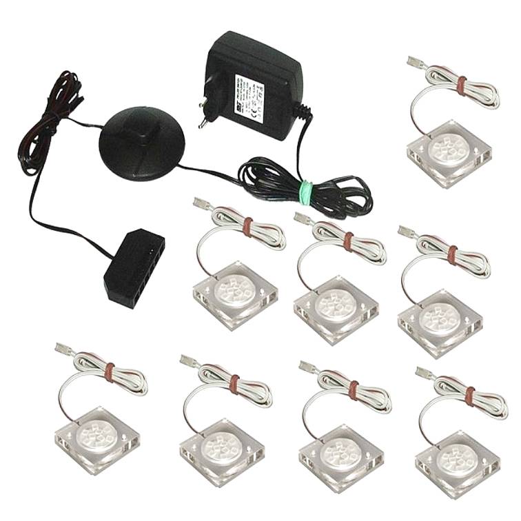 8 LED osvětlení pro dřevěné poličky ve vitríně. Balení obsahuje 8x stříbrnou sponu LED v bílé teplé barvě. Led klipsna - 1,5W 12V DC s délkou kabelu 2m, dělič NS25, zásuvkové s délkou kabelu 2m, dělič NS25, zásuvkové napájení s nožním spínačem a napájecího kabelu o délce 3m.