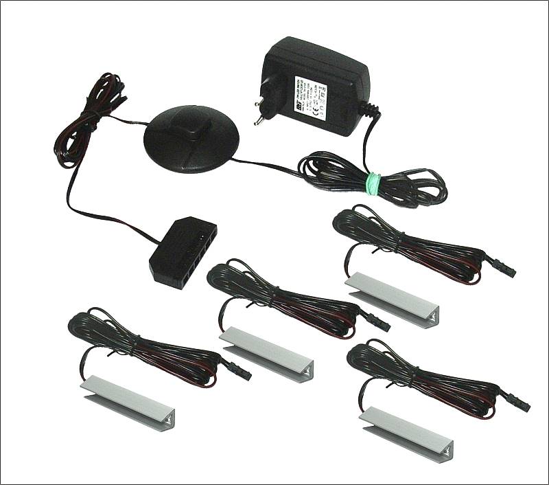 Čtyři LED osvětlení pro skleněné poličky ve vitríně.   Balení obsahuje 4x stříbrnou sponu LED v bílé teplé barvě.   LED klipsna - 12V DC 0,3W délky 5cm s délkou kabelu 2m, zásuvkové napájení s nočním spínačem a napájecího kabelu o délce 3m.... Více