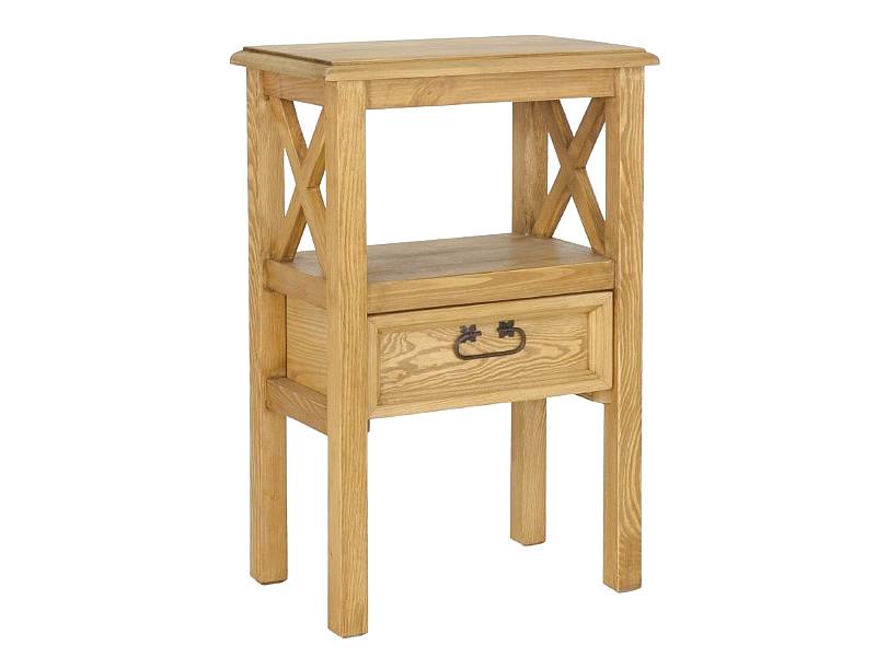 Voskovaný, masivní, dřevěný stolek má po stranách ozdobné křížky a šuplík. Šuplík se vysouvá na dřevěných pojezdech. K výrobě jsme použili ručně vyráběné úchytky v černé barvě. Tyto prvky vyrábíme vždy z masivního borovicového dřeva. Naše masivní dřevěný stolek dokončujeme vosky na bázi včelího vosku. Za zmínku stojí, že nabízíme několik barevných variant nábytku v různých odstínech vosku. Bezbarvý vosk K09, Světlý vosk K01, Tmavý vosk K02, Hnědý vosk K15.