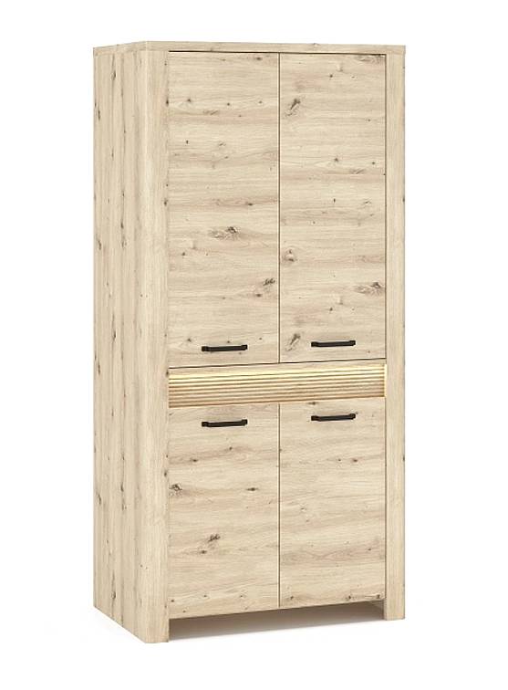 MORIS skříň 4d - je vybavená šatní tyči a polici a proto má k dispozici velký užitný prostor pro ukládání oblečení.   Kolekce MORIS je vyrobena z kvalitního lamina, jsou použity PCV hrany. Toto lamino působí velice originálním a přitom přirozeným dojmem.   Zesílené strany podél pevných bočních stěn jsou také jejích noganou, díky této metodě je nábytek ještě stabilnější.   Charakteristické a dekorativní dřevěné dražky jsou obohaceny o osvětlený LED pásek.   Kolekce MORIS v barvě dub artisan zaručuje skvělé aražmá v moderních i tradičních interierech.    Černé kovové úchyty a plastové nožky narušují tradiční vzhled nábytku a dodávají mu moderní svěžest.   Osvětlení uvnitř polic je k dispozici volitelné.   Nábytek je určen pro samostatnou montáž, dodávan v balících.