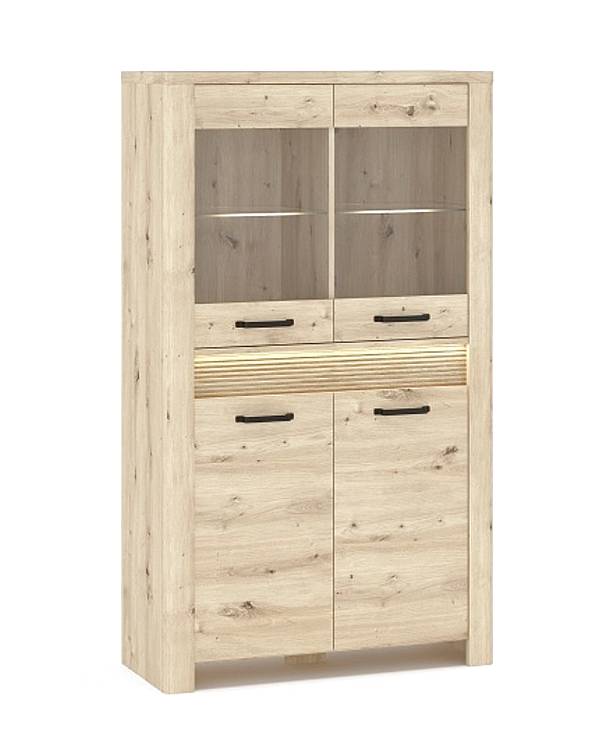 MORIS vitrína nízká 2d2w - je také vysoce praktická - má místo jak pro přechovávání různých věci v dolní skříňce, tak i pro vystavení těch nejzajimavějších předmětů v horní prosklené části.   Kolekce MORIS je vyrobena z kvalitního lamina, jsou použity PCV hrany. Toto lamino působí velice originálním a přitom přirozeným dojmem.   Zesílené strany podél pevných bočních stěn jsou také jejích noganou, díky této metodě je nábytek ještě stabilnější.   Charakteristické a dekorativní dřevěné dražky jsou obohaceny o osvětlený LED pásek.   Kolekce MORIS v barvě dub artisan zaručuje skvělé aražmá v moderních i tradičních interierech.    Černé kovové úchyty a plastové nožky narušují tradiční vzhled nábytku a dodávají mu moderní svěžest.   Osvětlení uvnitř polic je k dispozici volitelné.   Nábytek je určen pro samostatnou montáž, dodávan v balících.