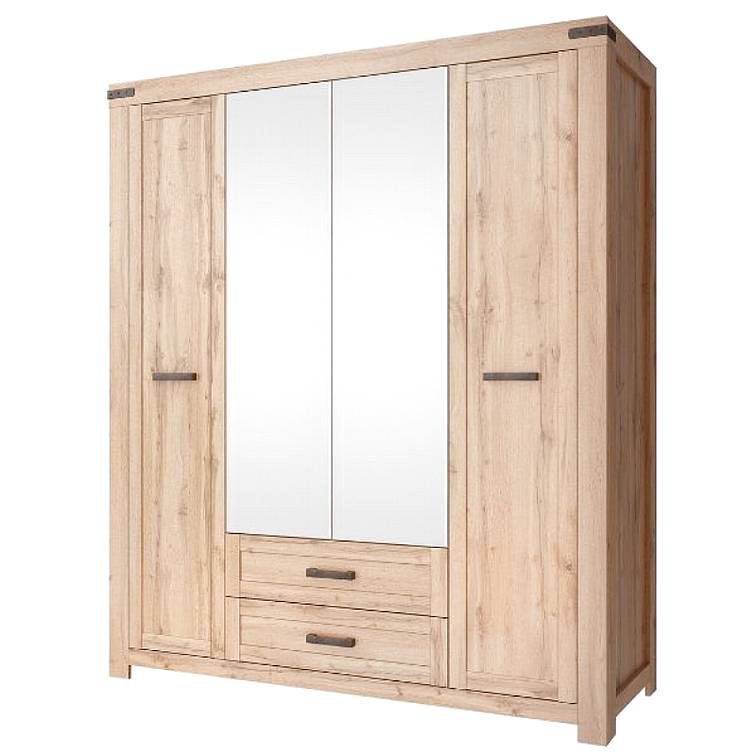 MORITZ skříň se zrcadlem 4d2s - dub wotan - je zde místo s tyčí na zavěšení kabátů, bund, má také police, na které můžete uspořádat oblečení. Velké praktické šuplíky. Velké zrcadlo majiteli jistě usnadní každodenní výběr správného šatníku.   Kolekce MORITZ v dubu wotan je kus nábytku v rustikálním stylu, který bude elegantním a praktickým doplňkem zařízení obývacího pokoje, jídelny, ložnice i předsíně. Vyznačuje se jednoduchým tvarem a přírodní dubovou barvou, která se bude hodit téměř do každého interiéru bez ohledu na jeho barvu.   Kolekce MORITZ je vyrobena z LDTD, Čela a dvířka jsou z MDF desky, disponuje kulíčkvými pojezdy šuplíku. Masivní plastové černé úchytky dokonalé ladí s nábytkem.   Volitelně lze nalepit ozdobné kování. Zákazník si sám určí, kde budou umístěny.   Jednoduchý design kolekce MORITZ poskytuje množství nádherných aranžmá.