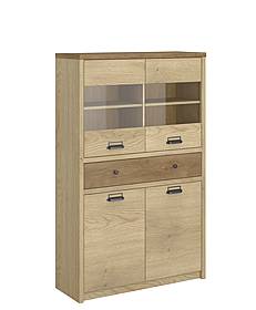 Vitrína Denzel 2d2w1s kombinuje dekory dub Cremona a dub Lefkas, vytváří teplou a přirozenou atmosféru a díky vysoké konstrukci, skleněným dvířkům a kovovým úchytkům podtrhuje loftový a moderní styl interiéru, ideální pro vystavení skla, knih nebo de...