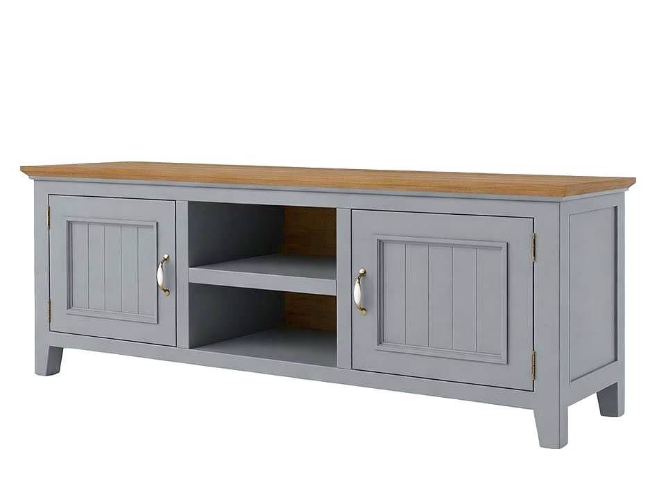 Elegantní televizní stolek LEVANDE v šedomodrém odstínu z bukového masivu s dubovou horní deskou je stylovým a praktickým doplňkem obývacího pokoje ve francouzském venkovském stylu.