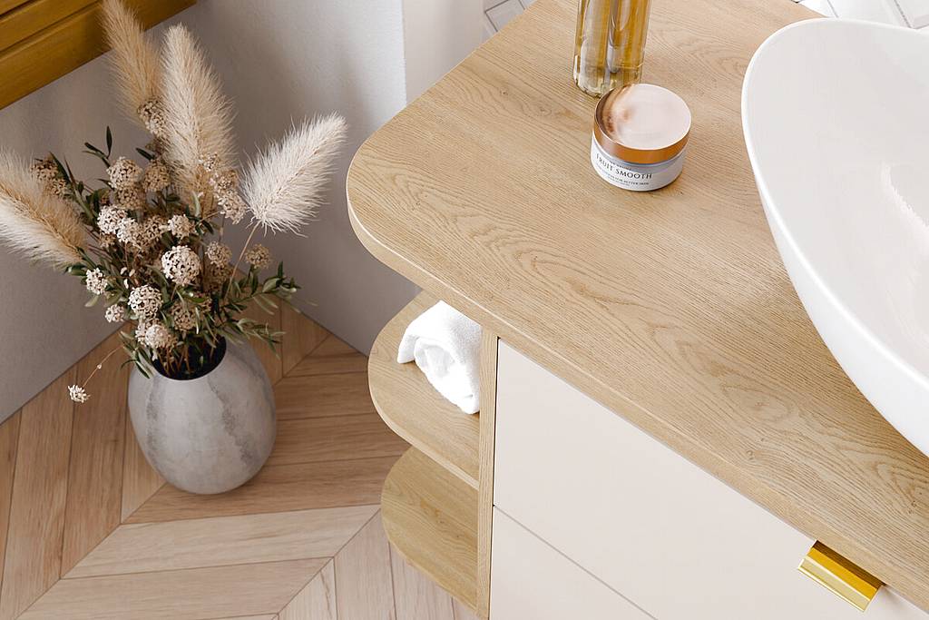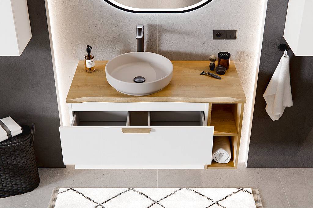 Koupelnová skříňka z kolekce Aster White s deskou a regály v dekoru dub Cremona nabízí minimalistický design v kombinaci s matnou bílou barvou. Praktické využití zajišťuje systém „push to open“, tiché dovírání a možnost kombinace více modulů pro variabilní uspořádání. Celkově jde o funkční a stylové řešení pro moderní koupelnu.