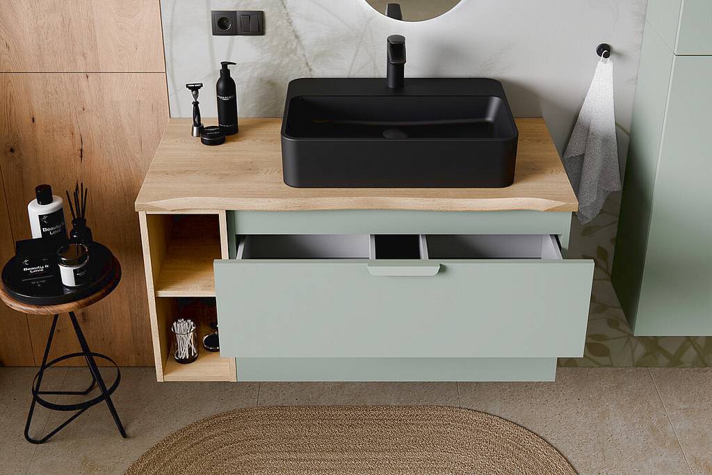 Koupelnová skříňka z kolekce Aster Green s deskou a regály v dekoru dub Cremona nabízí minimalistický design v kombinaci s matným zeleným odstínem Aloe. Praktické využití zajišťuje systém „push to open“, tiché dovírání a možnost kombinace více modulů... Více
