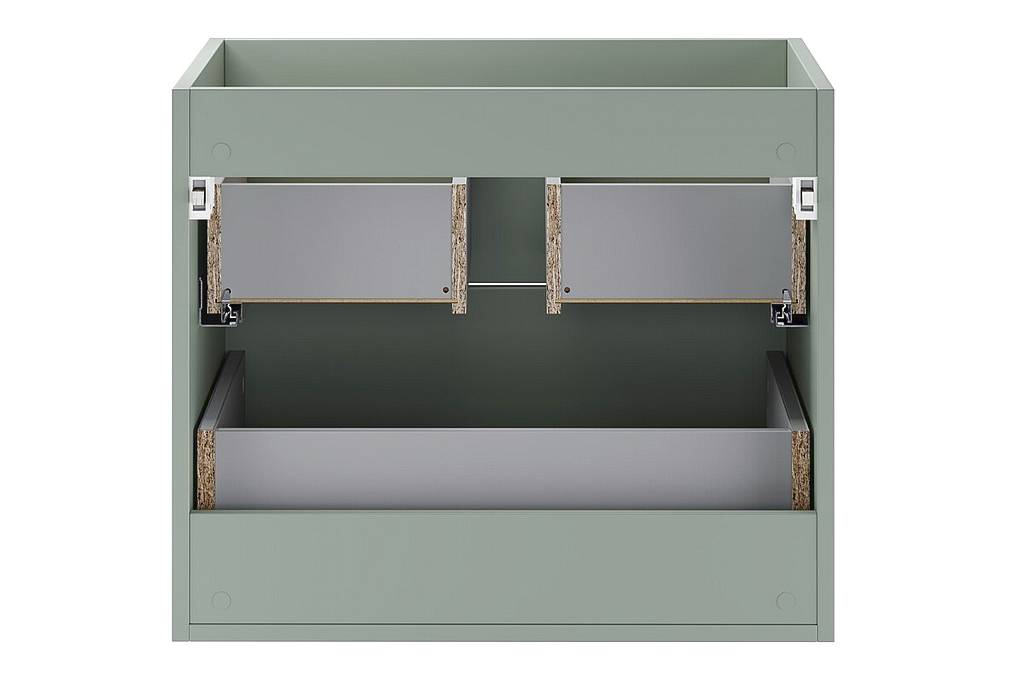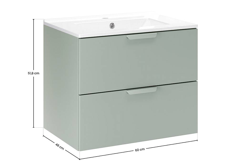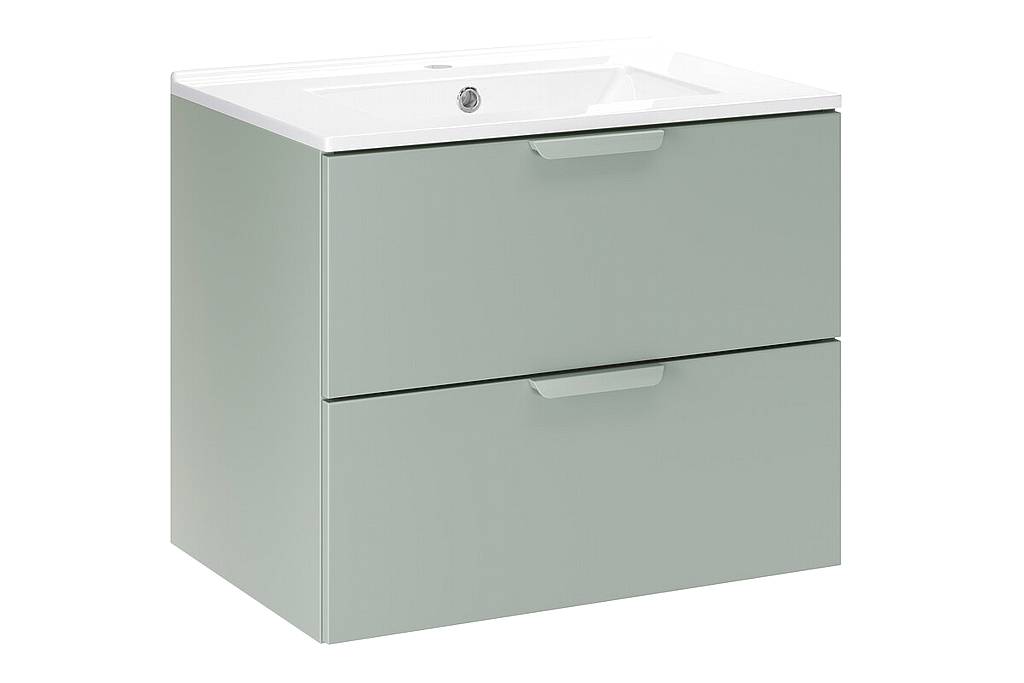 Skříňka pod umyvadlo 60 cm Aster Green s umyvadlem LAVA představuje moderní koupelnový nábytek v minimalistickém stylu s elegantním matným odstínem Aloe – zelená. Hladká čela bez rušivých prvků a nenápadně integrovaná úchytka vytvářejí čistý a moderní vzhled vhodný do stylové koupelny.