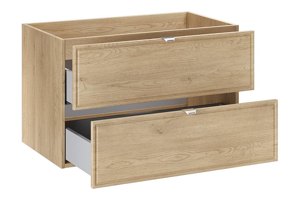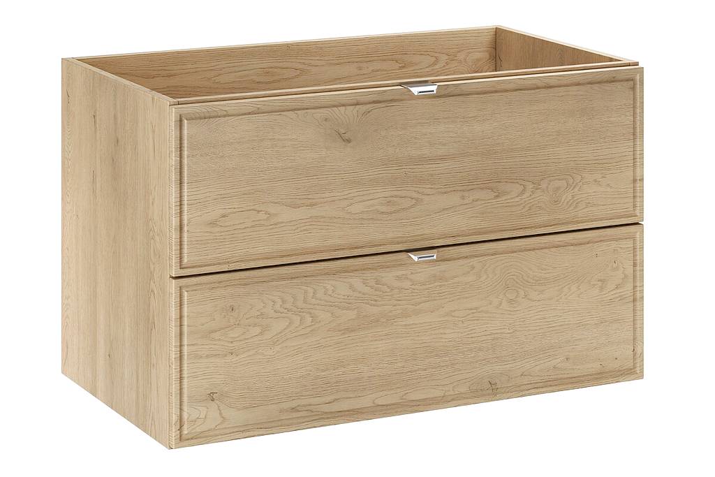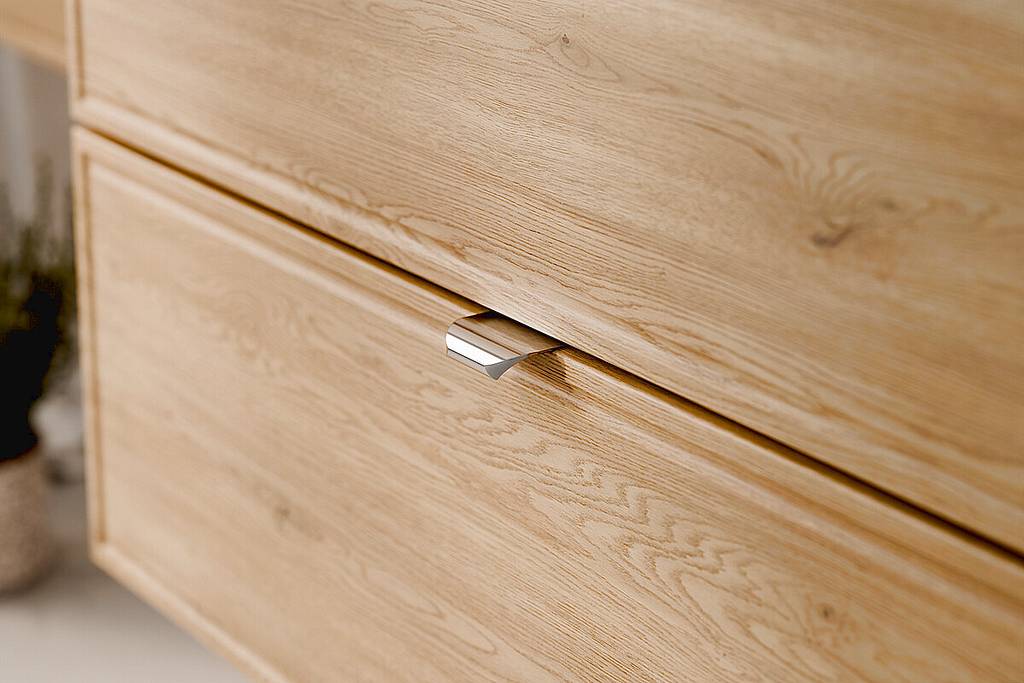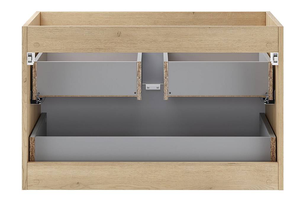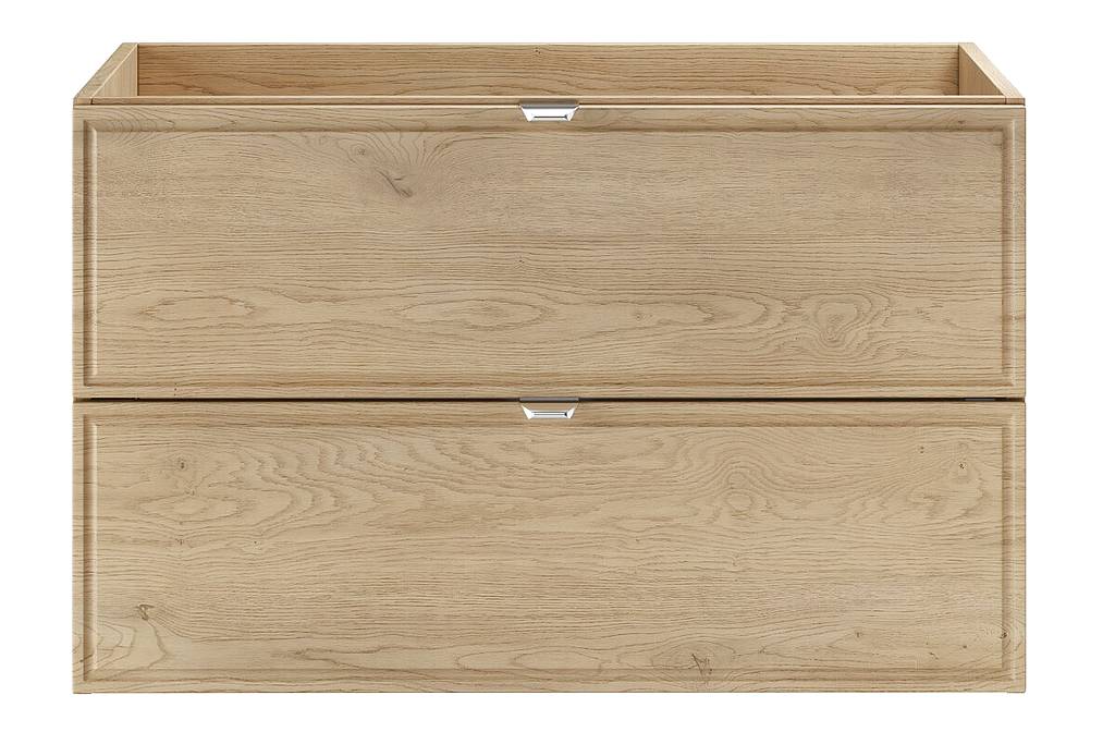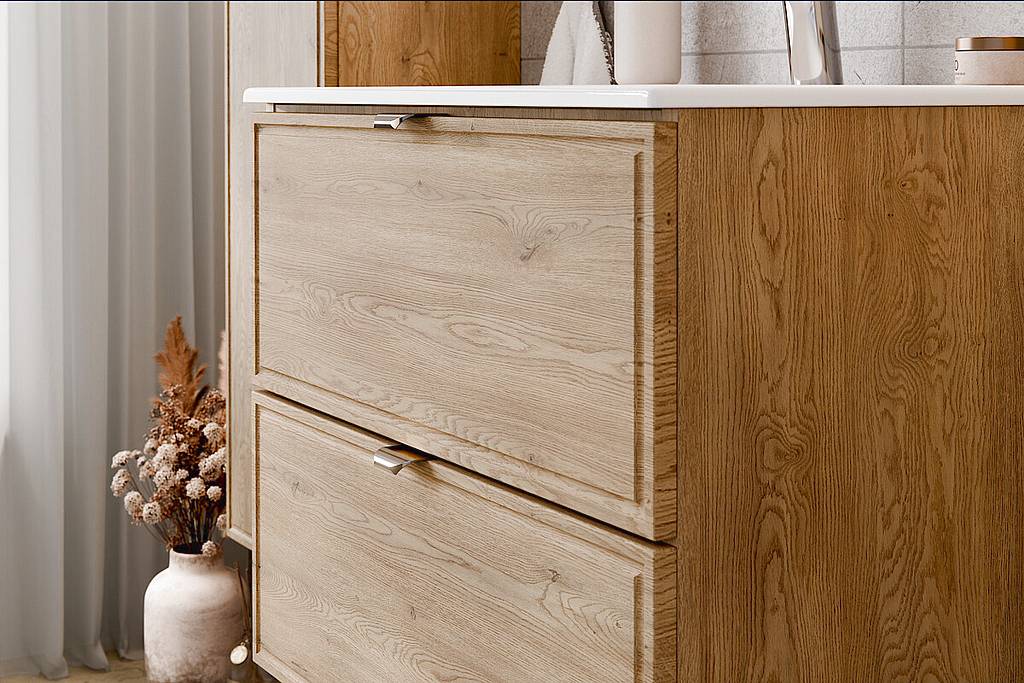 Skříňka pod umyvadlo 80 cm z kolekce Terra Cremona zaujme čely s jemně frézovaným rámem a dekorem dub Cremona, který zvýrazňuje přirozenou kresbu dřeva a dodává nábytku elegantní a teplý vzhled. Dvě zásuvky s tichým dovíráním poskytují praktický úložný prostor pro každodenní používání, zatímco stříbrné kovové úchytky podtrhují moderní a vkusné provedení.